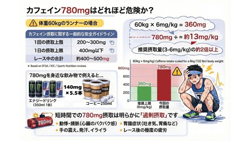 今回のウルトラマラソンで起きた体調不良は、単純に「カフェインを摂りすぎた」という一言では片付けられません。