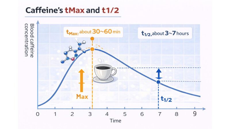 経口摂取されたカフェインは、**30〜60分で血中濃度が最大(tMax)**に達します。確かにこのくらいのタイミングで「効いてきた」と感じやすいですよね。しかし、その後すぐに効果が消えるわけではありません。
