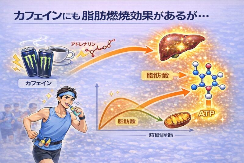 カフェインやパラキサンチンには、脂肪分解を促進する作用もあります。交感神経刺激を通じてアドレナリン系ホルモンが増え、脂肪酸が動員されやすくなるメカニズムです。一見すると、これはウルトラマラソン向きの作用に思えますが、ここには大きな落とし穴があります。