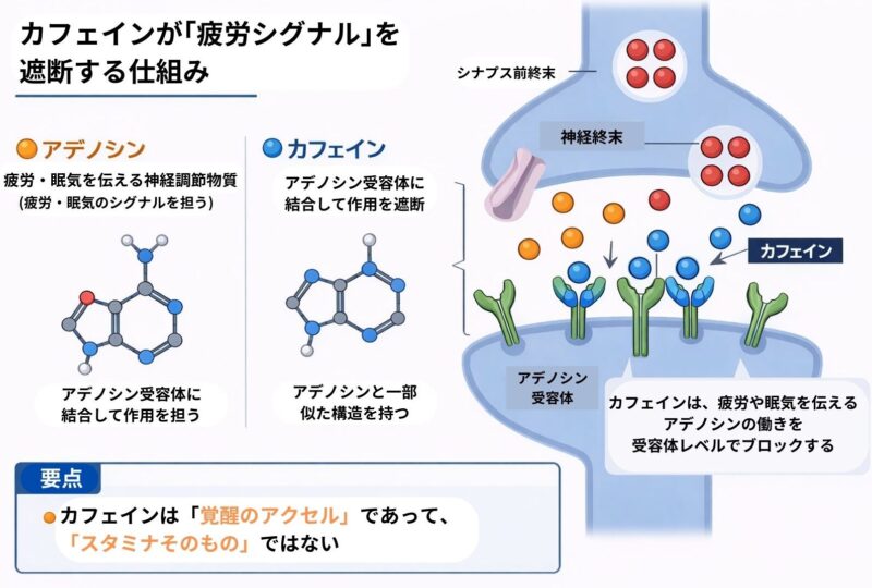カフェインは脳内のアデノシン受容体を遮断し、疲労感や眠気といったブレーキ信号を弱めます。その結果、同じペースで走っていても「まだ余裕がある」「動ける」というこれまでの疲労感が無くなる感覚が生まれます。もちろんこれは筋肉のエネルギーが増えたわけではなく、疲労の感じ方が変わっただけなのでただ脳を騙しているという状況です。