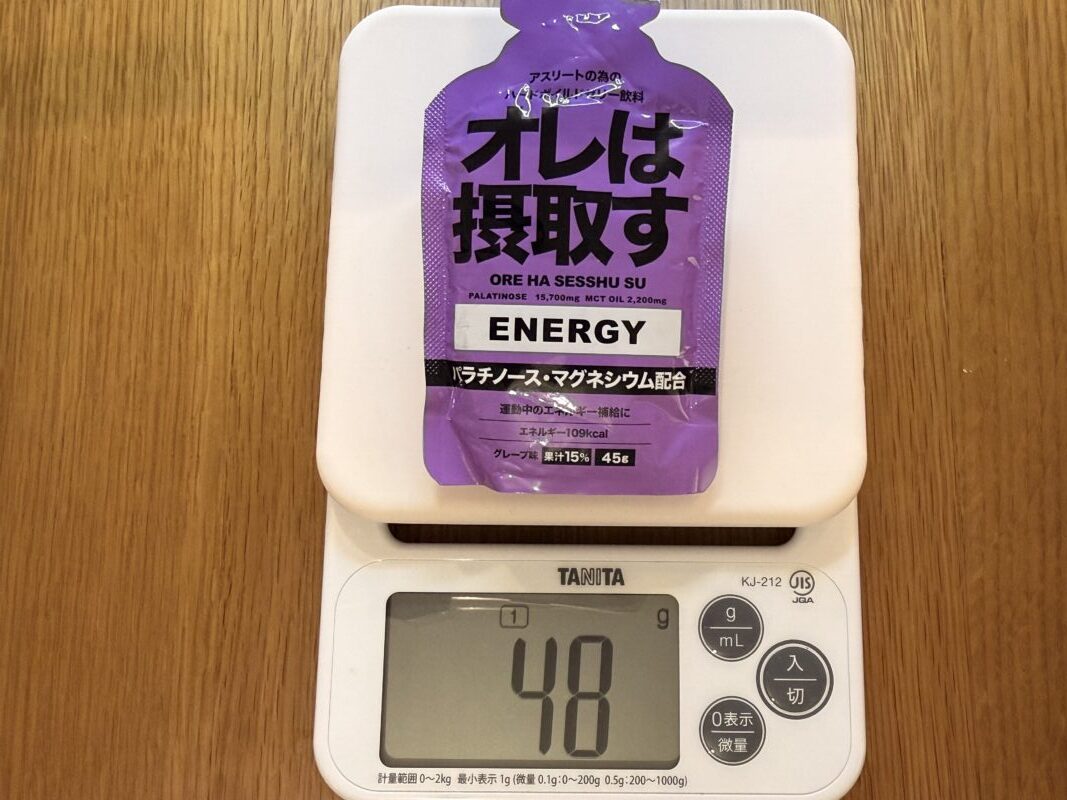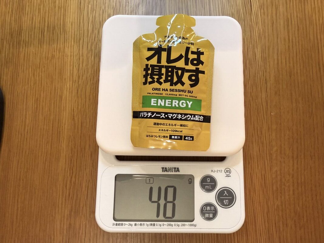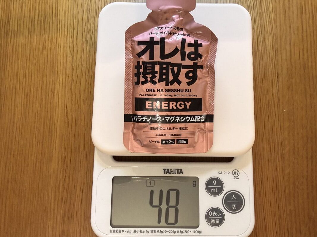 味は自然な甘さと程よい酸味のピーチ味で、普通に美味しい。もう少し薄めたら、いろはすの桃味として500ml飲めるくらい美味しい。レース中、どんなに辛くても、頑張らずに摂取できるのがこのオレは摂取すの強みだと思う。