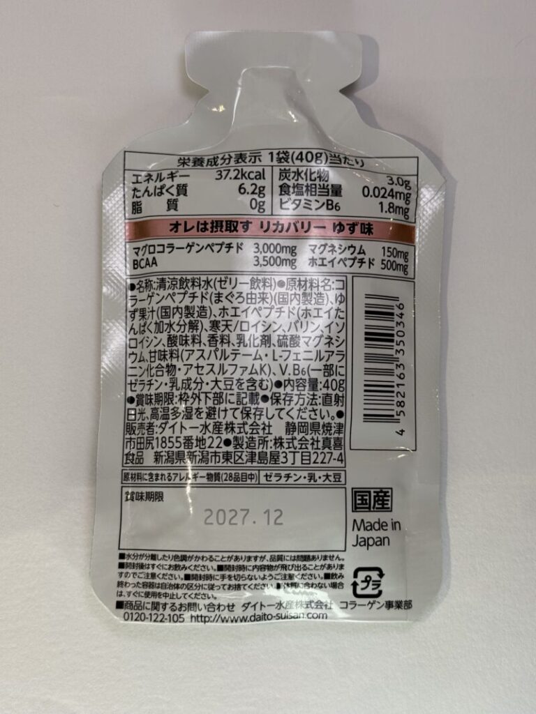 これはおそらくリカバリー向けの飲料としてはおそらく高級品である。値段も400円台だし。その正体は、これもおそらくマグロコラーゲンペプチド3000mg。そうこのオレは摂取すを生産しているのはダイトー水産で、もともとこのマグロペプチドを売りにこれらの製品を開発しているのだ。