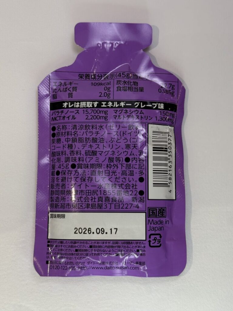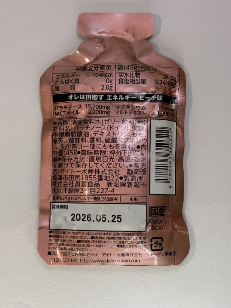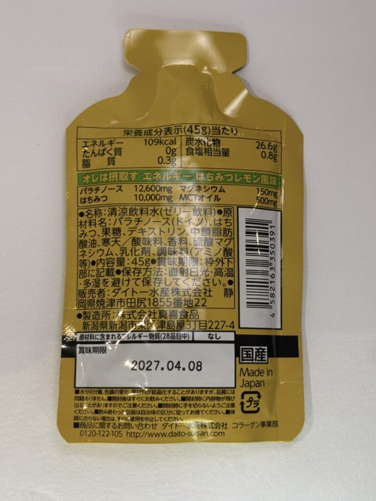 グレープ味、ピーチ味と異なる点はMCTオイルが2.2gから0.5gに減量されていること、パラチノースの含有量が3.1g減の12.6gとなっていること、果汁含有はないがはちみつが実際に添加されており10gも入っていることだろうか。