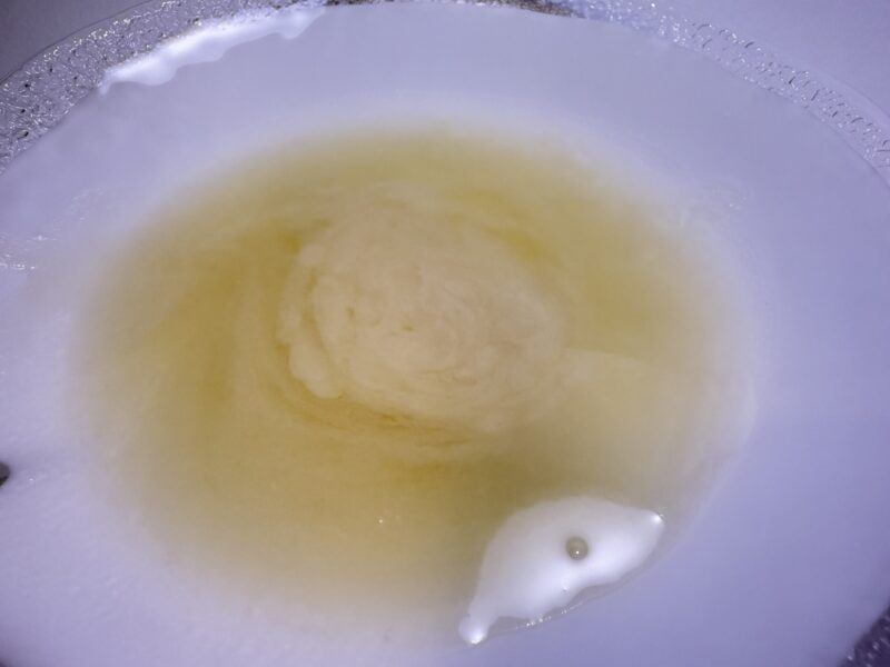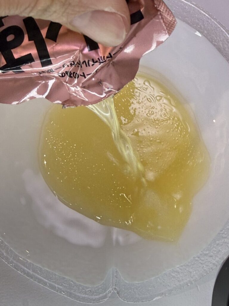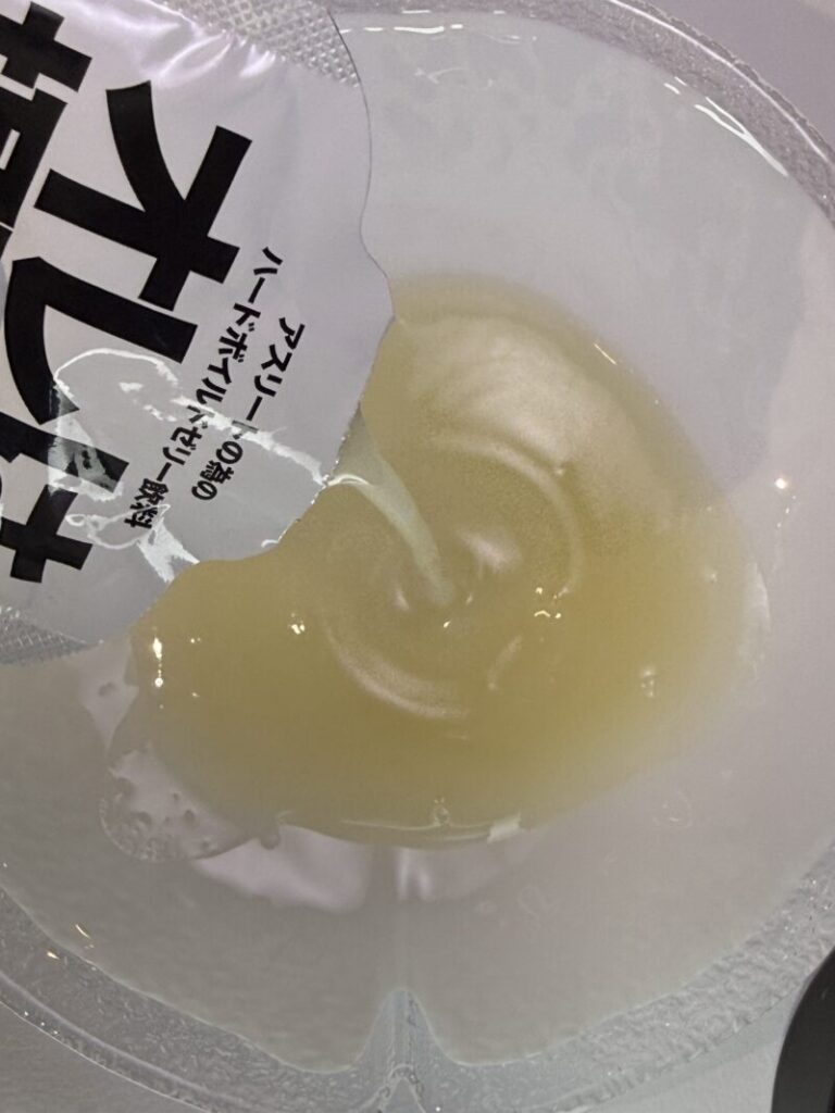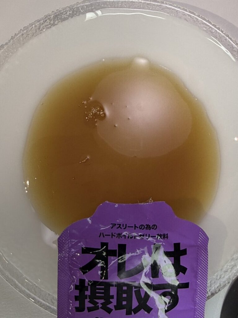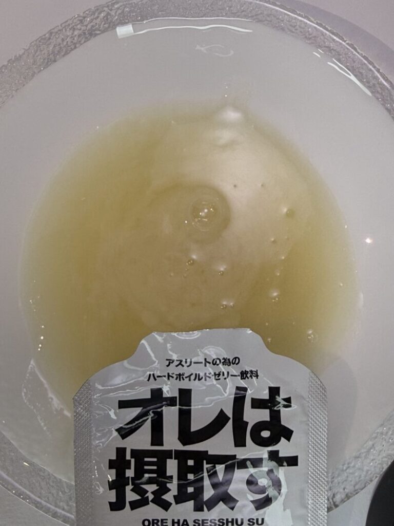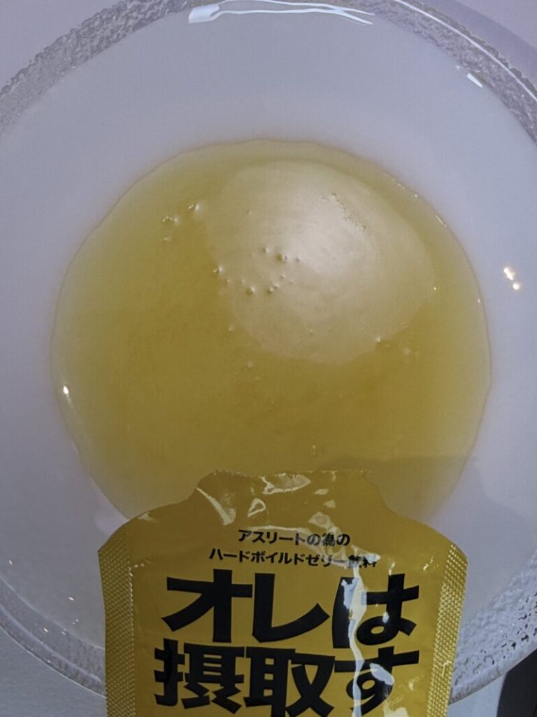 まず開封時に皿に出した時点で強烈なゆず臭を感じた。いわゆるポン酢くらい。これはなかなか強烈だと思ったので、いつもならしているパウチの直飲みを一旦遠慮した。そして気付いた。白濁しているものに。
