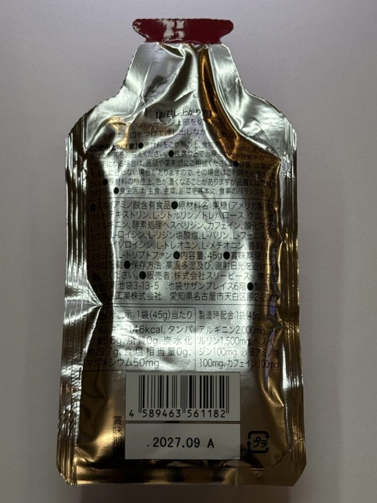 | 製品の特徴 | アルギニン、シトルリン、ヘスペリジン、必須アミノ酸、クエン酸、マグネシウム含有 |