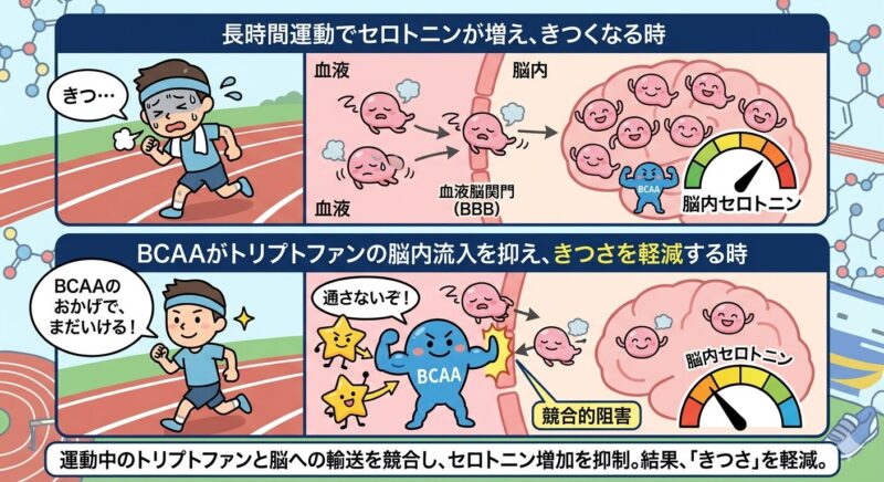 持久系スポーツにおいてBCAAに期待されている効果の中心は、「中枢性疲労の抑制」です。運動が長時間に及ぶと、血中のトリプトファンが増加し、それが脳内に取り込まれることでセロトニンが増え、疲労感が強まると考えられています。BCAAはこのトリプトファンと脳への輸送を競合するため、理論上はセロトニンの増加を抑え、結果として「きつさの感じ方」を軽減する可能性があります。