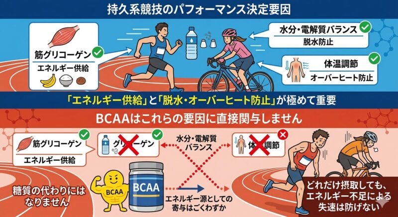 BCAAはこれらのどれにも直接関与しません。エネルギー源としての寄与はごくわずかであり、糖質の代わりにはなりません。したがって、どれだけBCAAを摂取しても、エネルギー不足による失速そのものを防ぐことはできないのです。