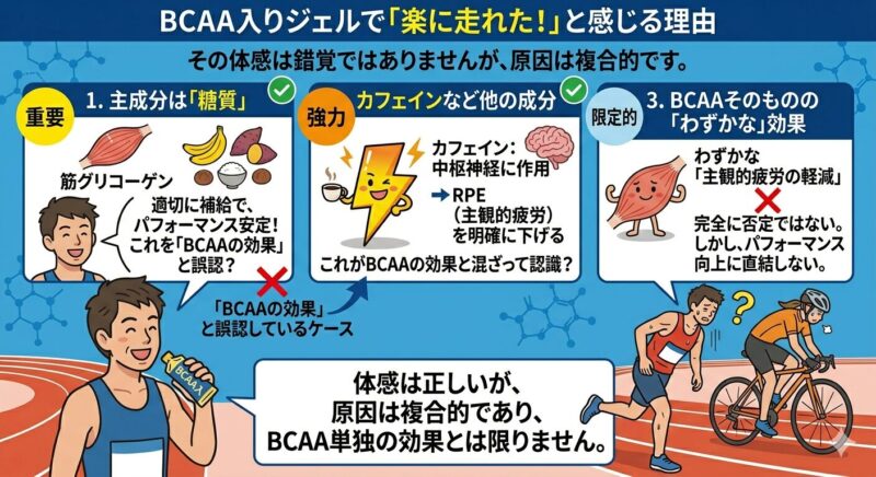 それでもBCAA入りのジェルを摂取して、マラソンが楽に走れた!記録が伸びた!思ったより出し切れた!と感じるランナーがいるのは事実です。この体感は錯覚ではありませんが、その原因は単一でもありません。