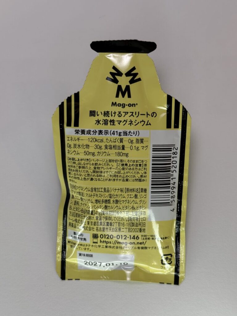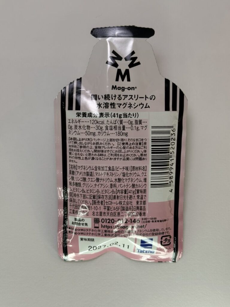 こちらのgeleeジェリータイプは通常のMag-onとほとんど成分量や構成は同じながらも、食感をジェリータイプにしているのであのどろっとした水飴タイプが苦手なランナーにとっても摂取しやすいのが狙いだろう。