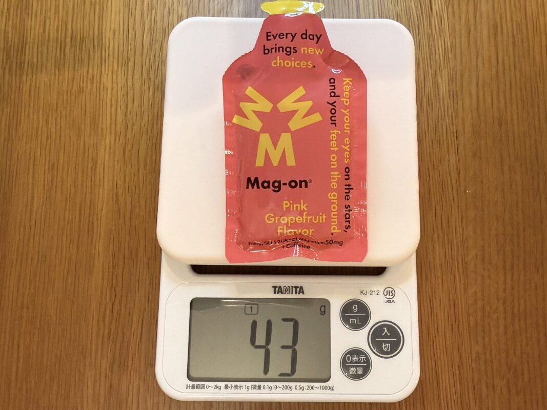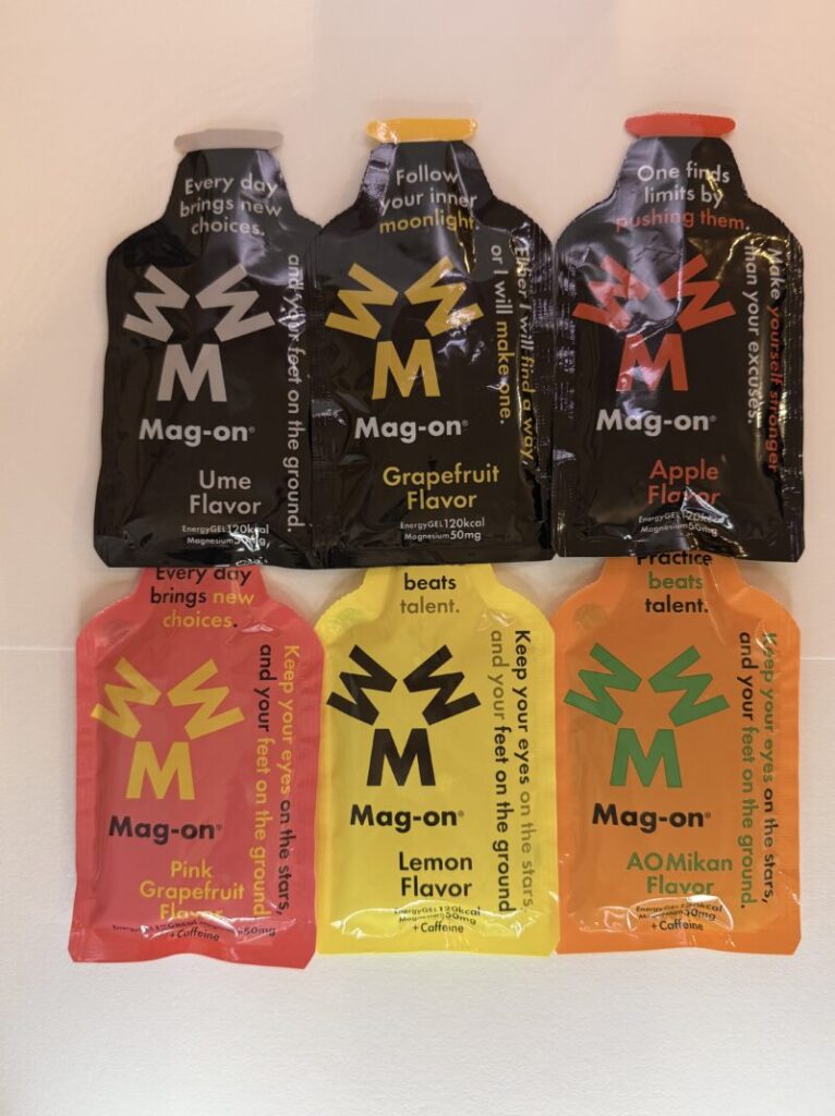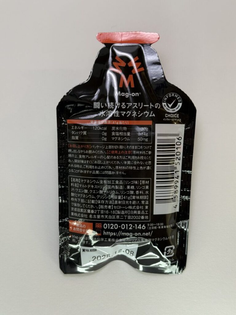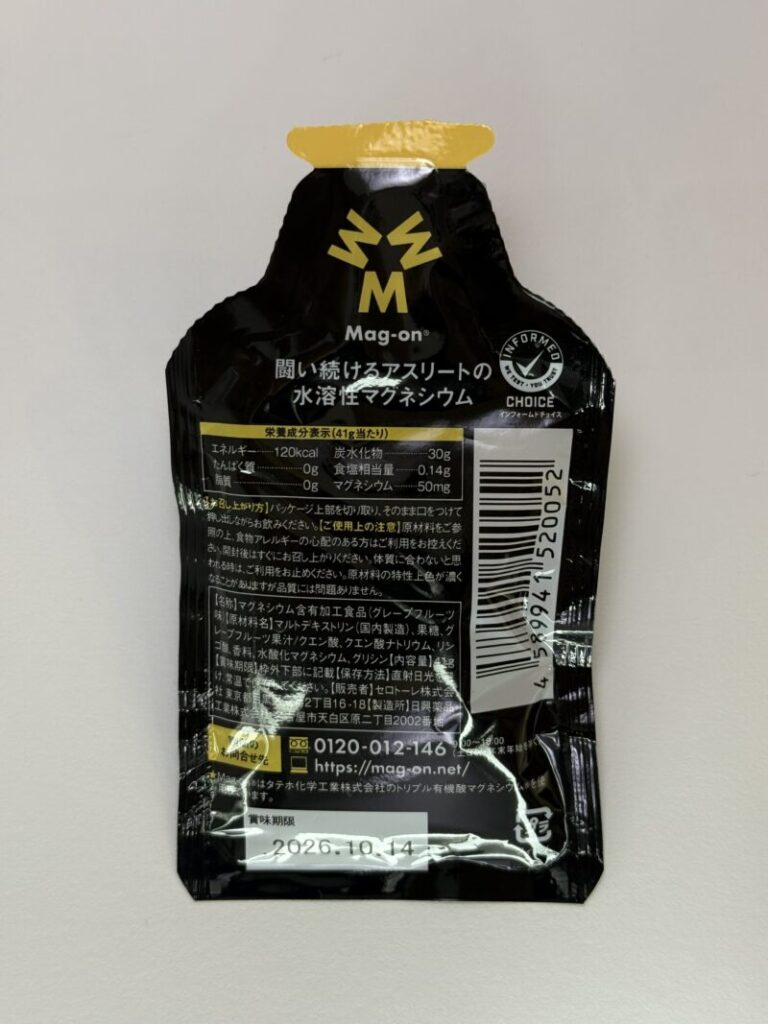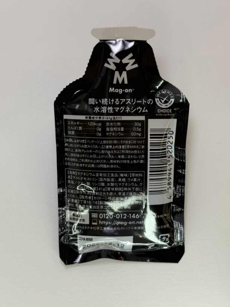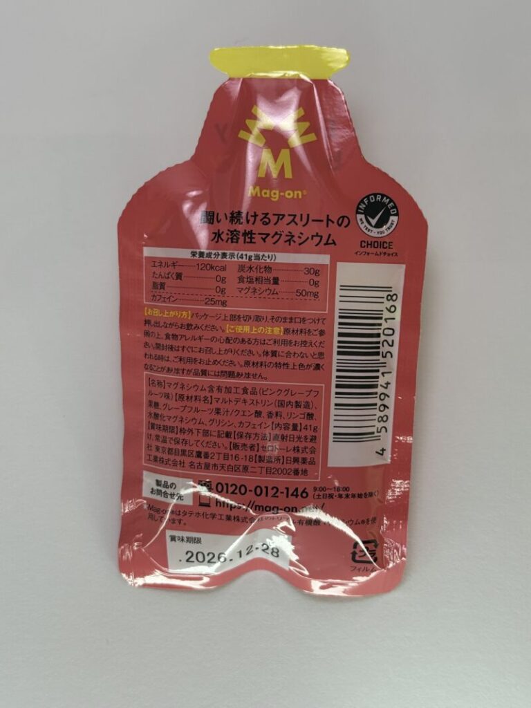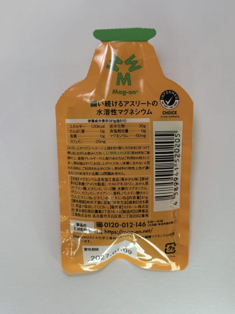 ここからはMag-onのカフェイン25mg含有バージョンです。黒主体のパッケージがカフェインなし、カラフルパッケージがカフェイン含有ありのバージョンとなっています。とはいえ含有量は控えめな25mgで、大量にMag-onジェルを摂取しても特に問題にならないように設計されています。