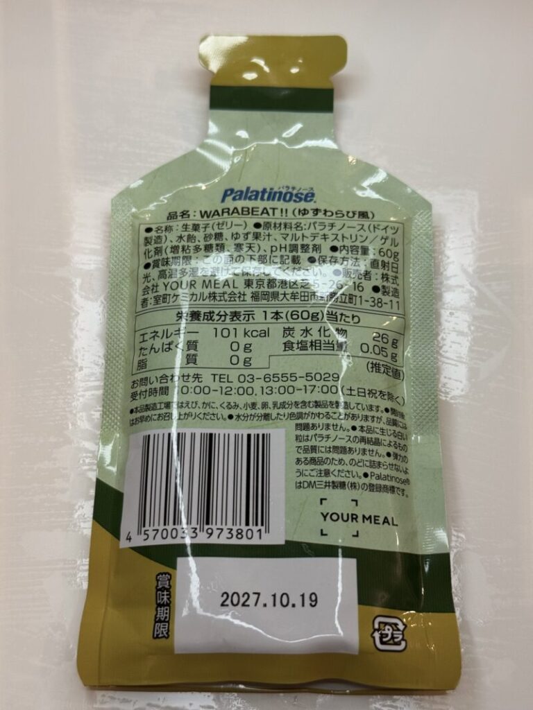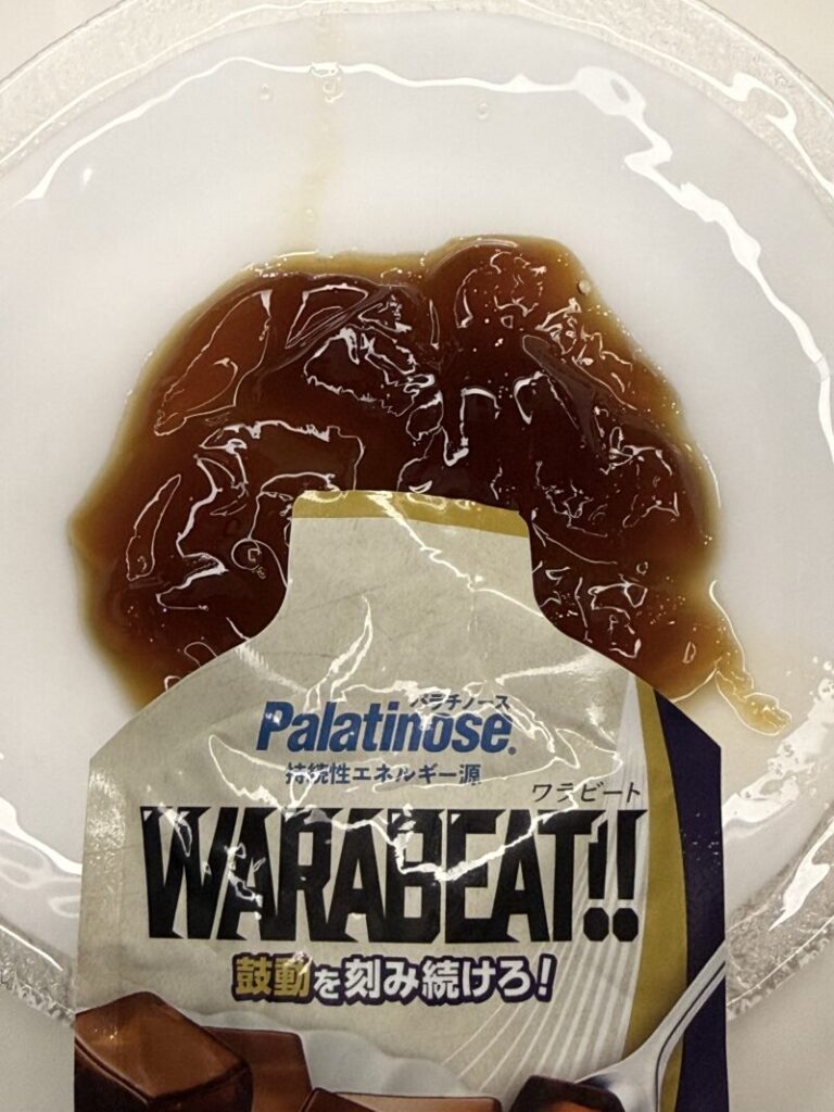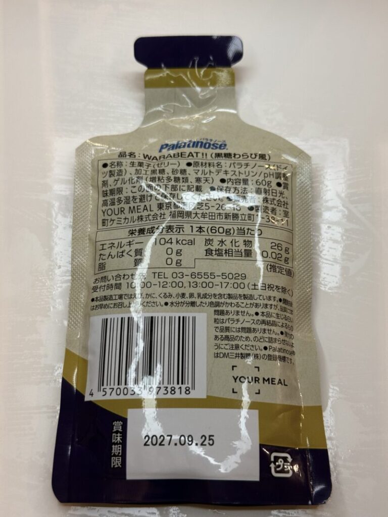開発としての狙いは従来のジェルにありきたりなフルーツ系フレーバーから脱却し、どろっとしたエナジェル独自の食感が苦手な層にアプローチした製品らしい。実際にトレイルランシーンで、セブンイレブンのわらびもち(スティック羊羹と同じ形状をしたもの)を好んで使っていた時期もあったので、ランニングにわらびもちはやぶさかではない組み合わせと言える。