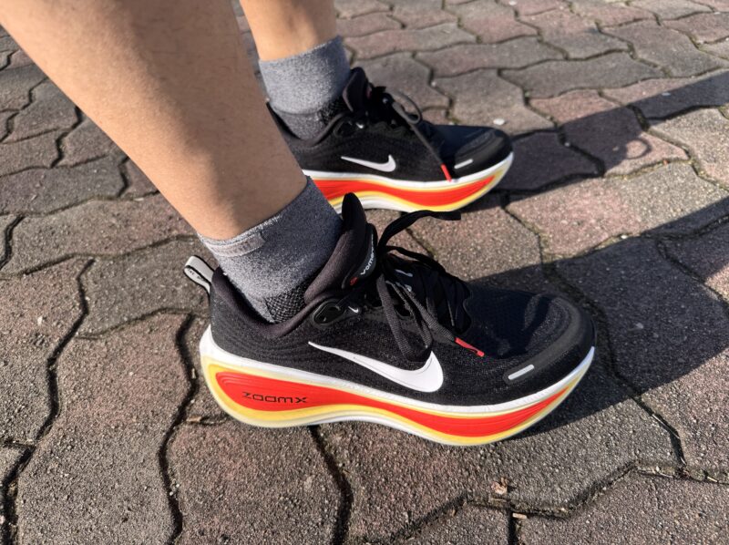 クッション特化と聞くとジョグにしか使えなさそうですが、実際に履いてみるとそんなことはなく、ボメロ18やボメロプラスで使用されているZoomXのミッドソール素材が高反発なため簡単にスピードを上げていくこともできます。