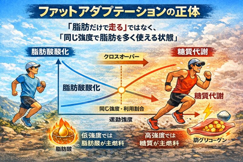 まず前提として整理しておきたいのは、ファットアダプテーションとは「脂肪だけで走る状態」を指すわけではないという点です。運動中のエネルギー供給は脂肪と糖質の両方から行われており、その割合は運動強度によって変化します。一般的に、強度が低いほど脂肪の寄与が大きくなり、強度が上がるにつれて糖質への依存が高まります。この関係はクロスオーバーコンセプトとして知られており、ファットアダプテーションとはこのエネルギー利用のバランスをわずかに脂肪側へシフトさせる適応に過ぎません。