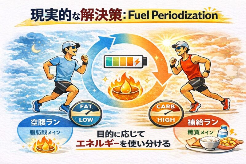 高強度のトレーニングでは十分な糖質を確保し、質の高い刺激を入れることを優先します。一方で、低強度のセッションにおいては、必要に応じて糖質をやや抑えることで脂肪利用能力を引き出すことも可能です。このように、目的に応じて燃料を使い分けることが、市民ランナーにとって最も現実的で再現性の高い戦略となります。