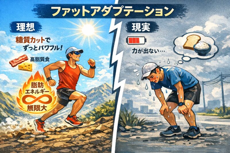 この考え方は特にウルトラマラソンやトレイルランニングといった長時間競技の文脈で広まりましたが、その一部だけが切り取られた結果、「糖質を減らせば強くなる」という単純な理解に変換されてしまった側面があります。