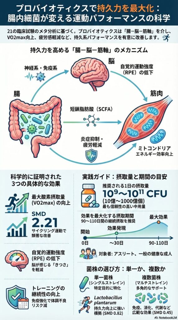 - VO2max(最大酸素摂取量)が向上! メタ分析の結果、プロバイオティクスの摂取はVO2maxを有意に高めることが示されています。酸素をエネルギーに変える効率が上がるため、より速く、より長く走れるようになります。